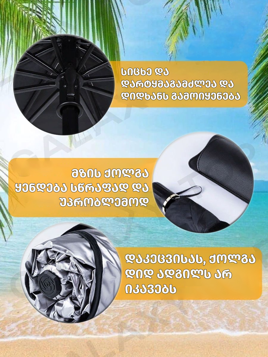 იდეალური ხელსაწყო მანქანის ინტერიერისა და პანელის მზისგან დასაცავად - საქარე მინის დასაკეცი ქოლგა არის შეუცვლელი აქსესუარი, რომელიც დაიცავს თქვენს მანქანას მზის სხივების მავნე ზემოქმედებისაგან. ეს აქსესუარი ძალიან კარგი საშუალებაა იმისთვის, რომ დაიცვათ თქვენი მანქანა და სალონი მზის სხივებისა და სიცხისგან.